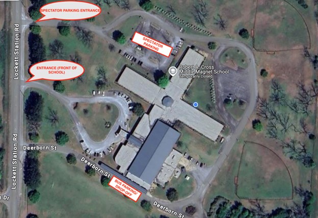PARKING: Teams can be dropped off on the bus ramp. Buses can park along the bus ramp. Spectators may park in available areas in the front of the building or in the staff parking. Click here to view the school map.